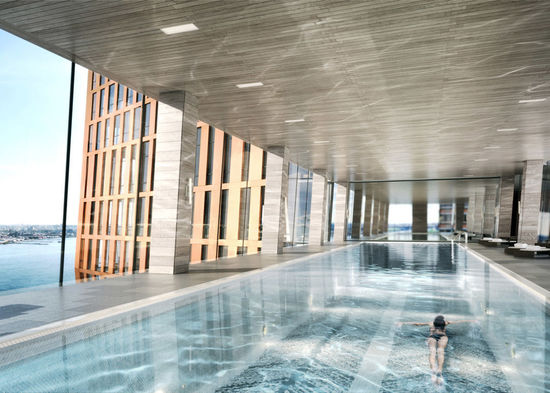 建筑將包括近 800 個套間,可用作工作室或者套間的公寓。三層天橋里有一個 75 英尺 (23 米) 長的游泳池、熱水浴池、酒吧和會客廳,相當(dāng)于是整體住宅的交流中心。橋本身是封閉的,兩邊安裝了玻璃幕墻,可以眺望對面 East River 的景色和曼哈頓建筑群。身處在其中恐怕會忘記這是一架懸空的橋梁,但看風(fēng)景的絕好視線想必會增加游泳或鍛煉的動力吧。